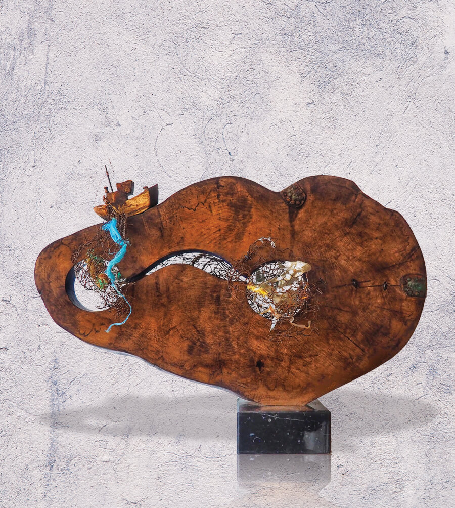 Wood, copper, steel, found and recycled objects. Size: 53cm x 43cm x 13cm